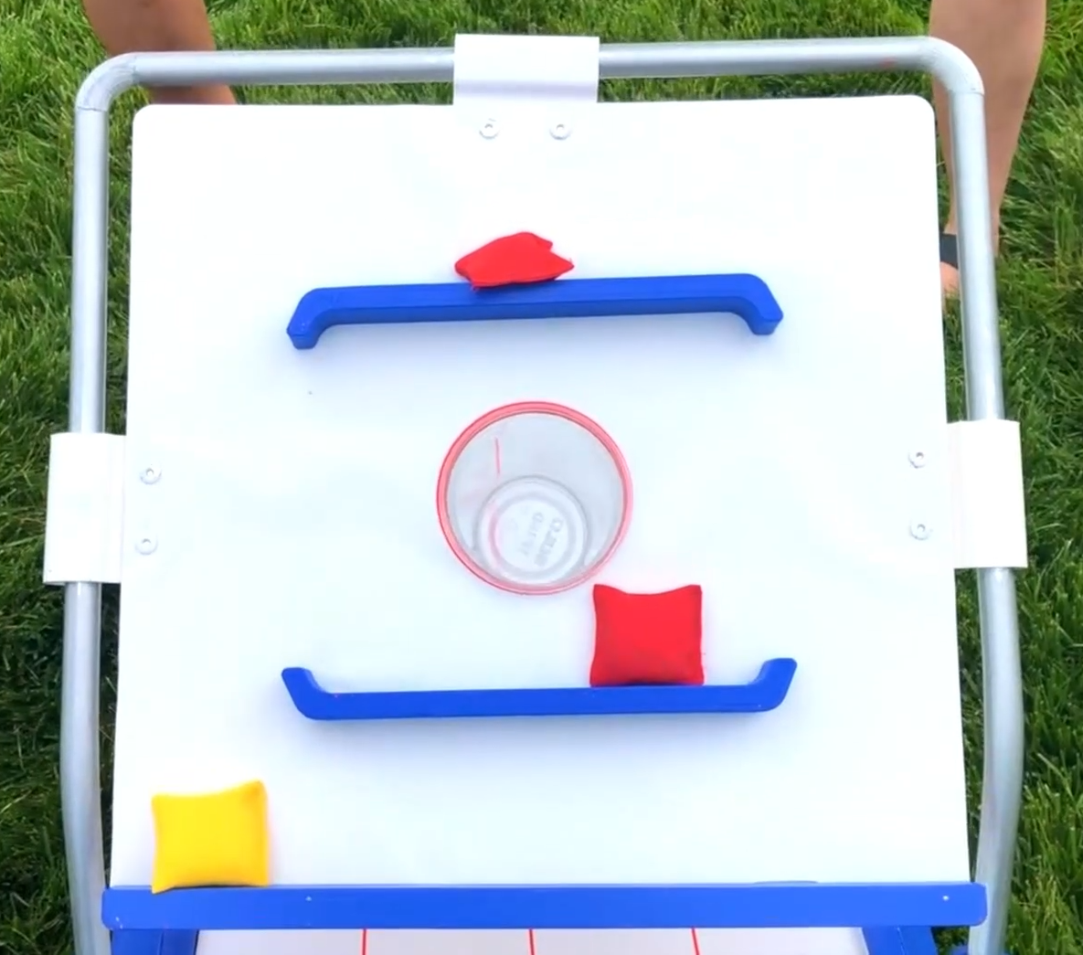 Each team stands behind a ramp and will stay there for the entire game. The team that goes first gets all four bags. If you are a beginner, feel free to use all 8 bags. Don’t forget who went first! The team that goes second will have a ‘Redemption Round’ if the team that shoots first is first to make all six cups. One player from each team (even if 2v2) shoots all four bean bags per round. After the fourth shot, all cups that were successfully made should be removed from the target and the other team takes their turn.